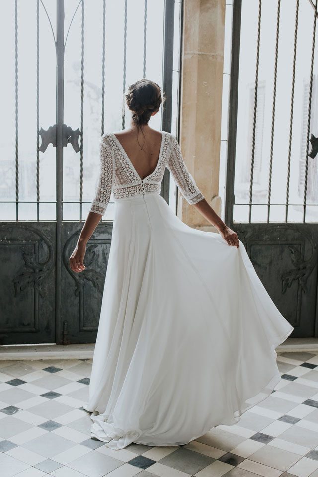 La parte trasera del vestido continúa con una terminación en escote en pico, que aporta un elemento de originalidad y sofisticación. La falda, en línea A y confeccionada en crepé, termina en una delicada tela de gasa, lo que proporciona una caída y un vuelo espectaculares. Además, culmina en una mini cola que brinda un toque de elegancia sin sacrificar la comodidad, ideal para las novias que desean moverse con libertad.