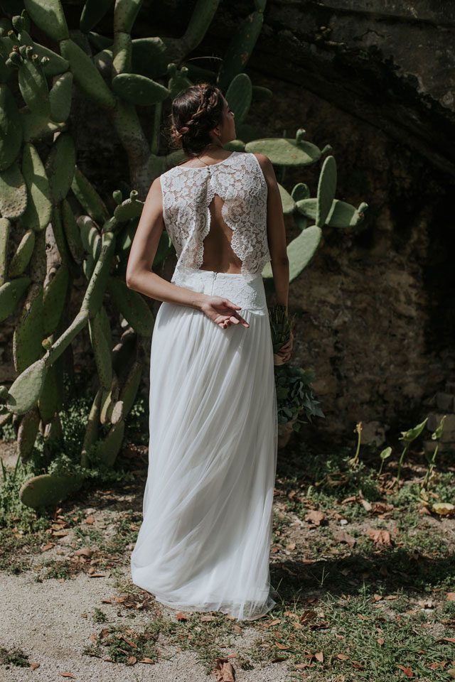 El «Top Carolina» está diseñado pensando en los detalles. Sus mangas, adornadas con encaje a juego, aportan un toque de elegancia adicional. La parte posterior abierta añade un toque de intriga y sensualidad, haciendo que cada paso que des hacia el altar sea verdaderamente inolvidable. Este top es la elección perfecta para las novias que desean una apariencia única que combina la elegancia clásica con un toque contemporáneo.